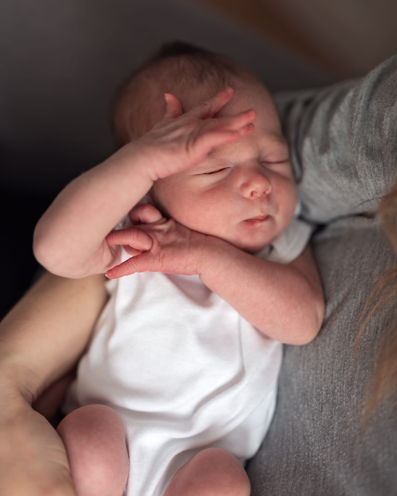 - Odłóż z widoku butelki, kubki, jedzenie — chyba że chcesz zdjęcie „prawdziwy poranek z noworodkiem” (wtedy kubek kawy jest OK).