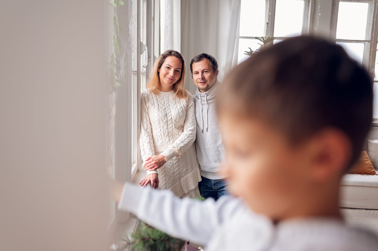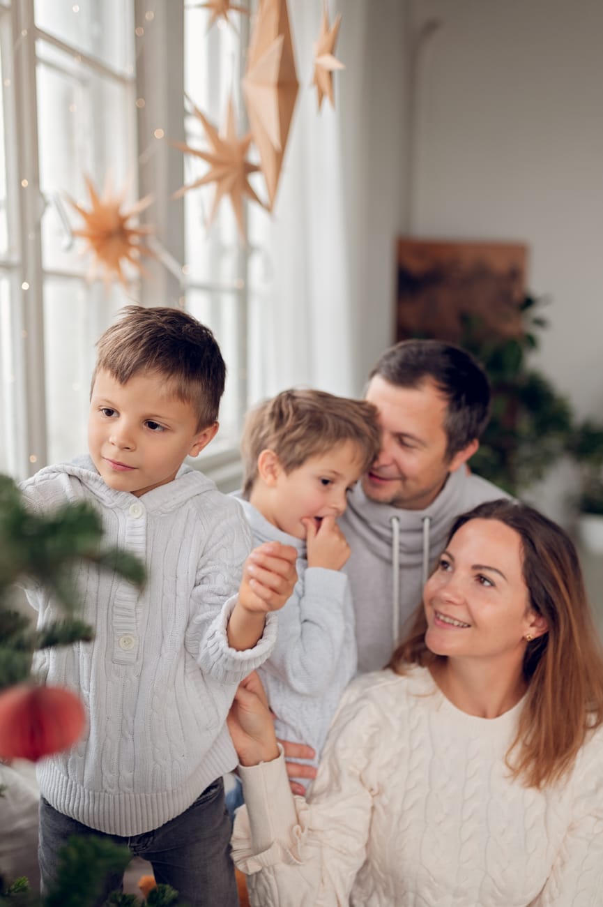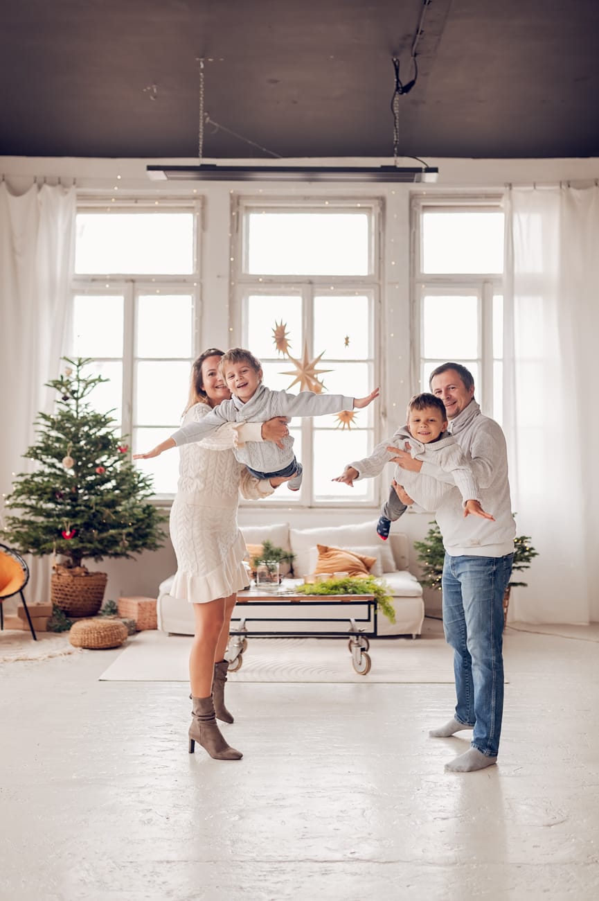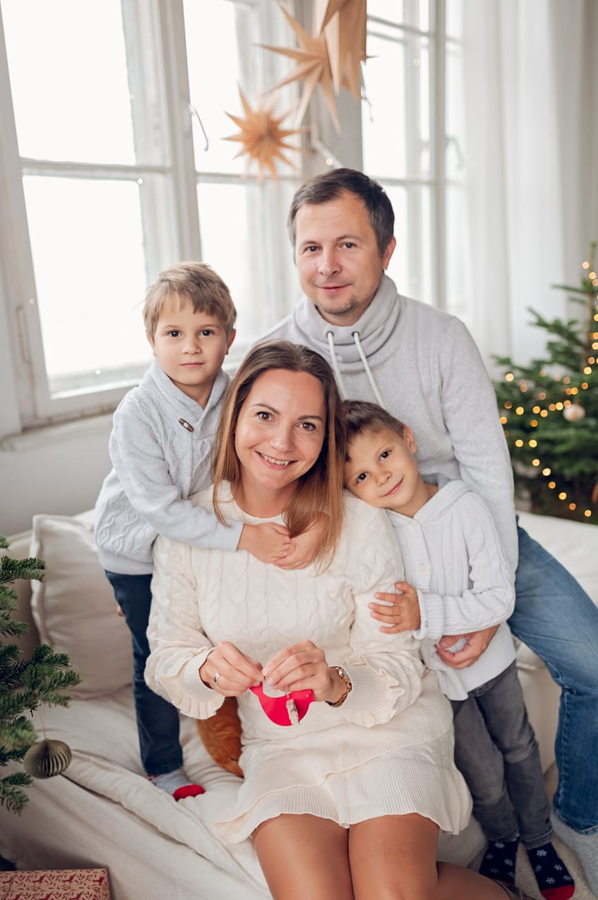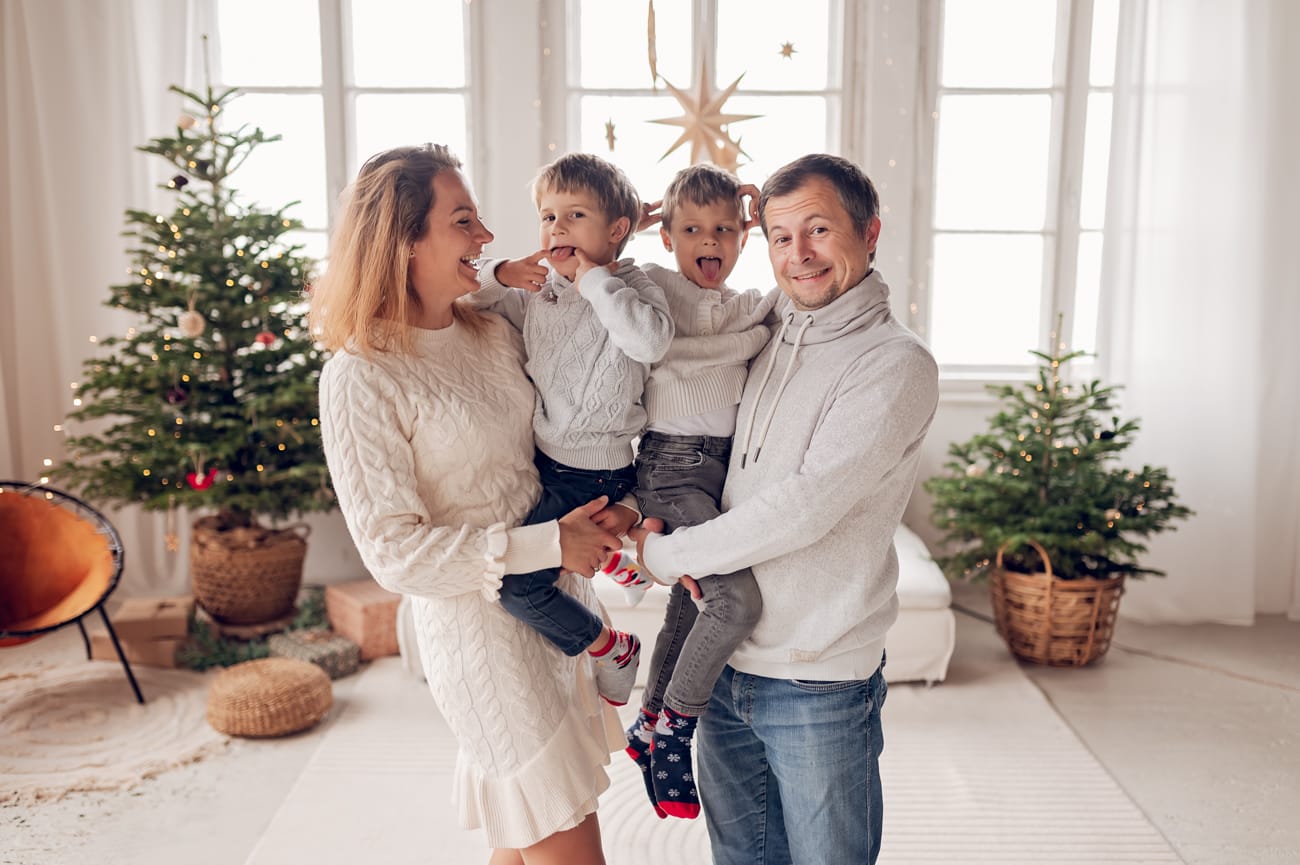 Wybierane przeze mnie studia łączą ze sobą świąteczny klimat z domowym ciepłem. A to znaczy, że nie ma u mnie miejsca na zbędne ozdoby czy sztuczne rekwizyty, sesja świąteczna koncentruje się na Was – na emocjach, uśmiechach i naturalnej radości. Tłem są tu naturalne elementy, jak zielone drzewka, które wprowadzają atmosferę świąt, ale nie przytłaczają zdjęć. Minimalistyczna przestrzeń umożliwia mi stworzenie subtelnych, ale zarazem wyjątkowych kadrów, w których główną rolę gra rodzina.