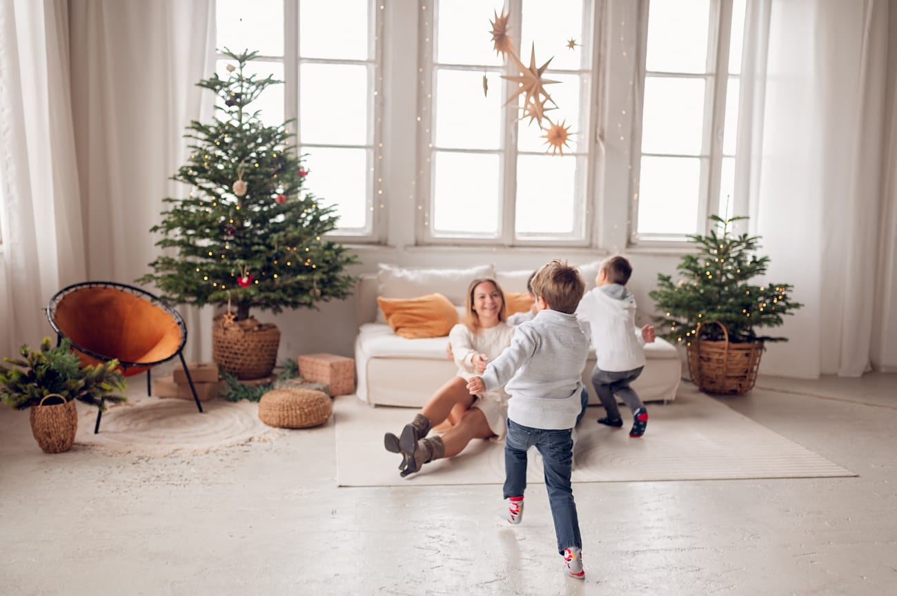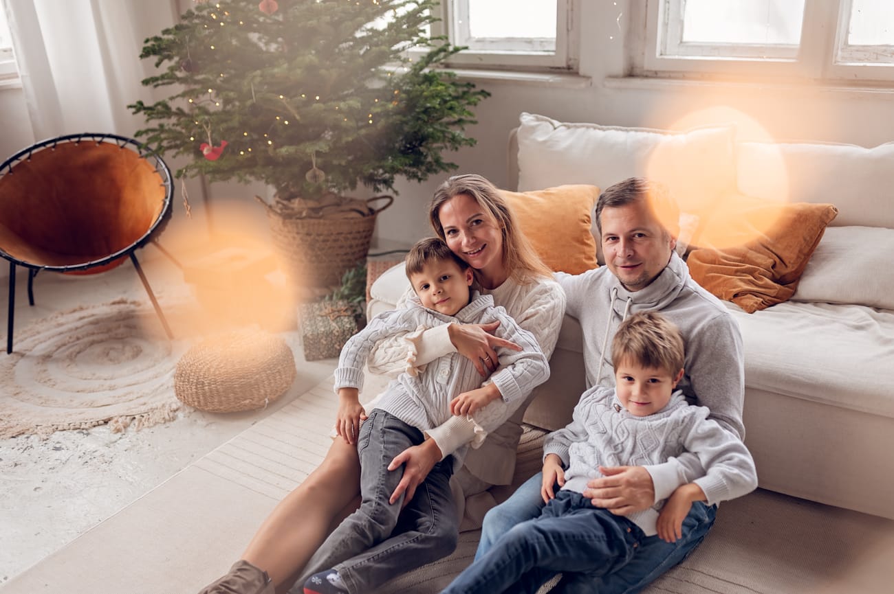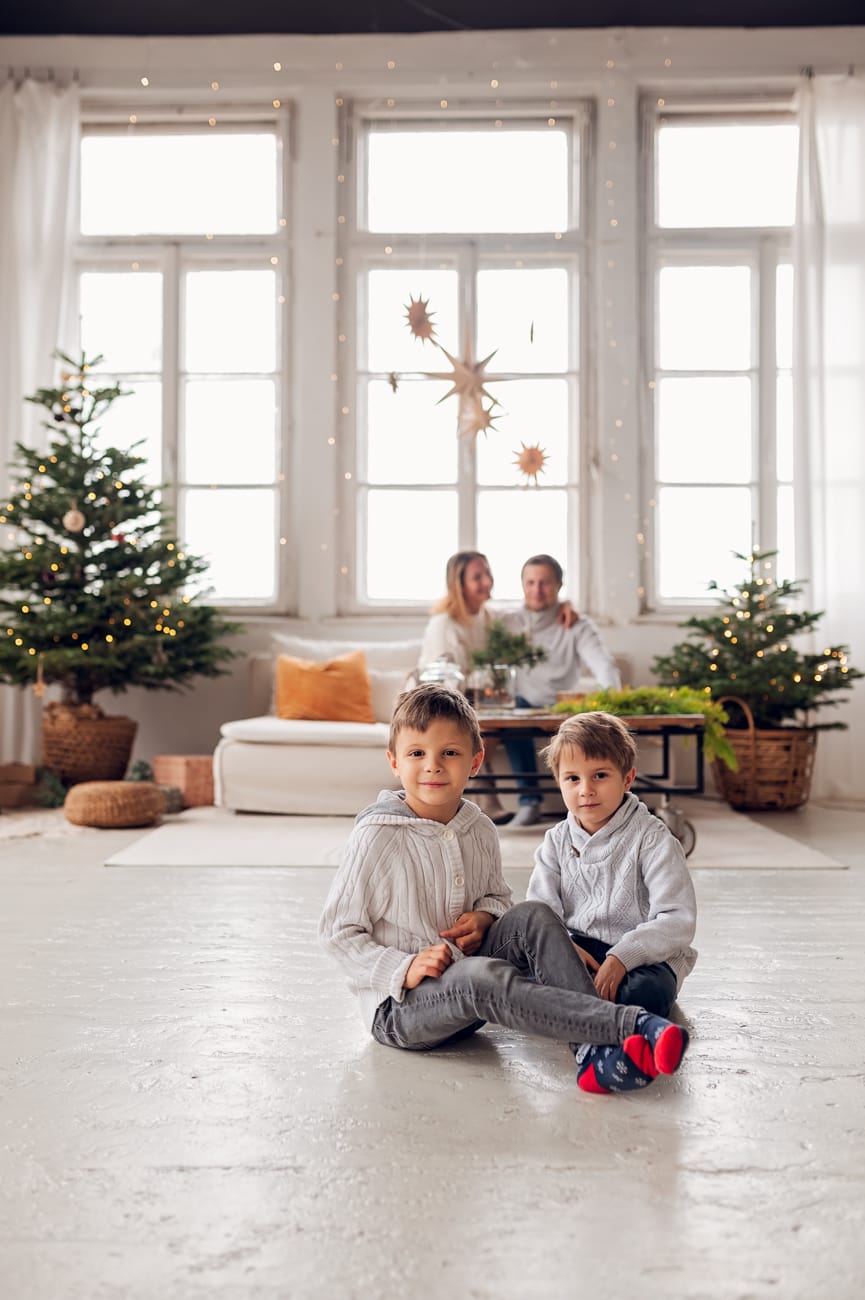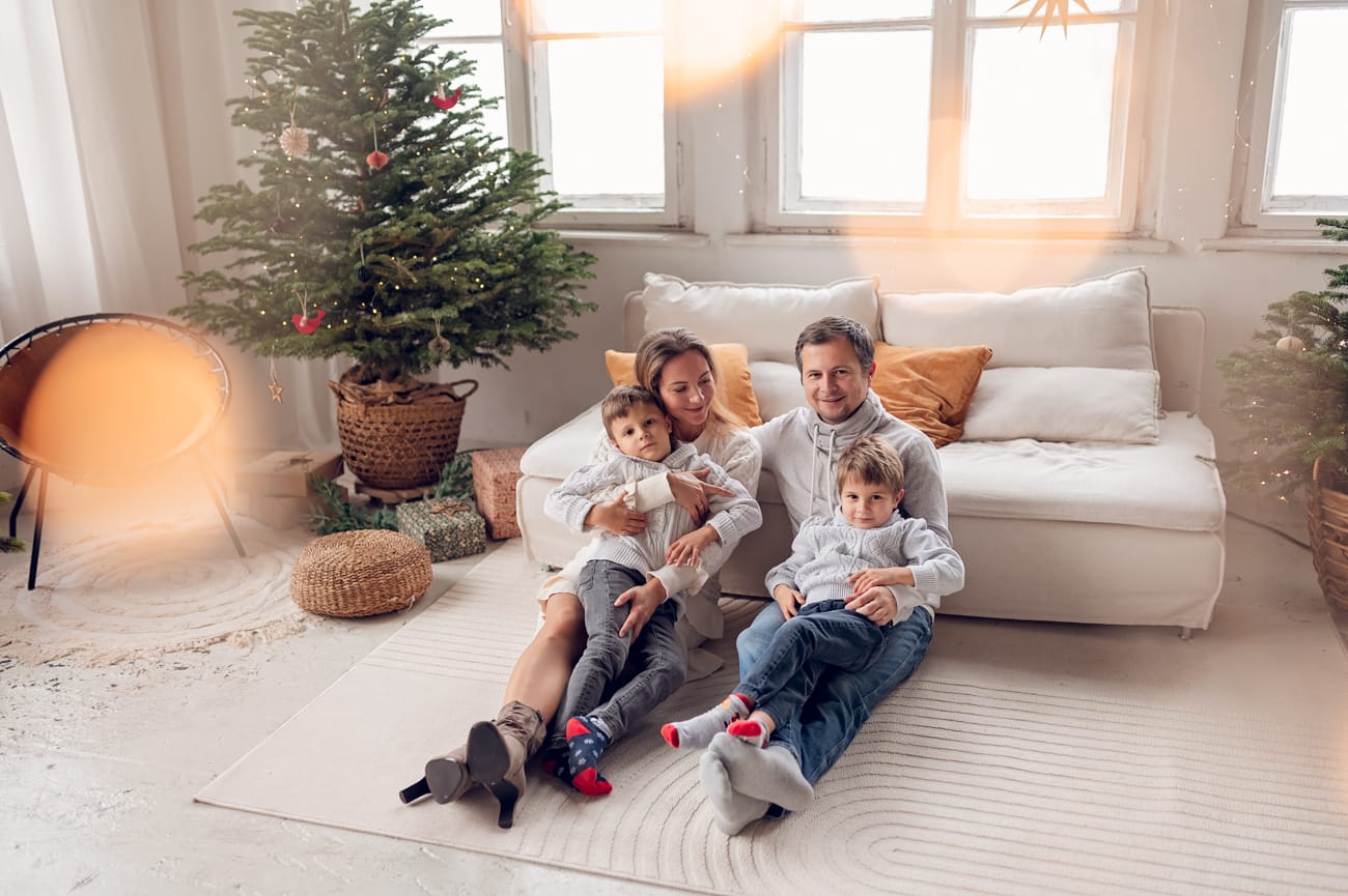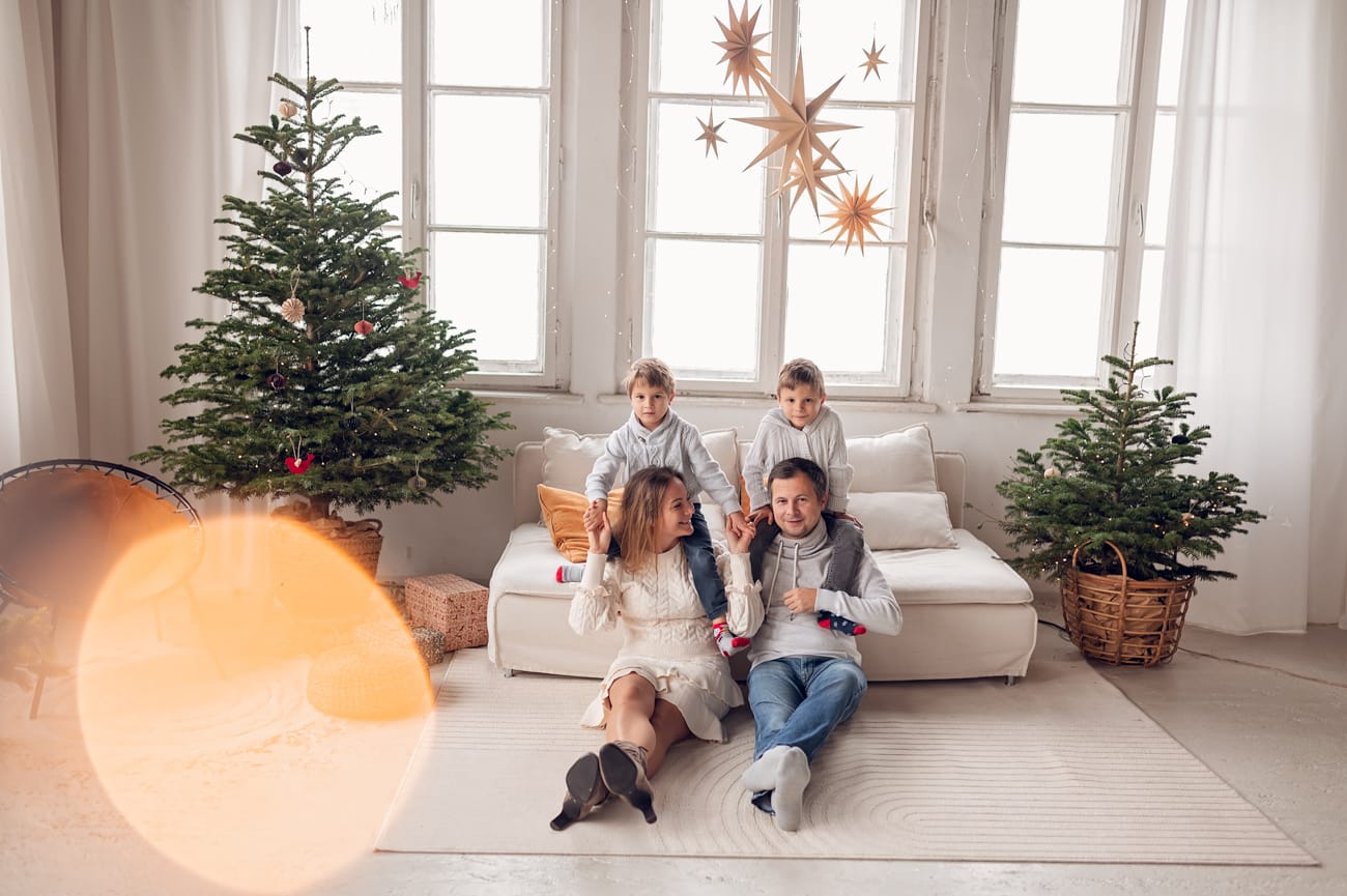 W trakcie sesji w naszym studio skupiamy się na tym, co najważniejsze – na Waszej bliskości i relacjach. Dlatego możecie swobodnie usiąść na wygodnej kanapie, pobawić się z dziećmi, a przestrzeń do szaleństw zapewni mnóstwo radości dla najmłodszych. W tle zamiast sztucznego scenariusza są delikatnie oświetlone drzewka, które nadają świątecznego klimatu bez nadmiernej ingerencji. Dzięki temu zdjęcia są pełne ciepła i autentyczności, a minimalistyczne otoczenie podkreśla to, co najpiękniejsze – Waszą rodzinę.